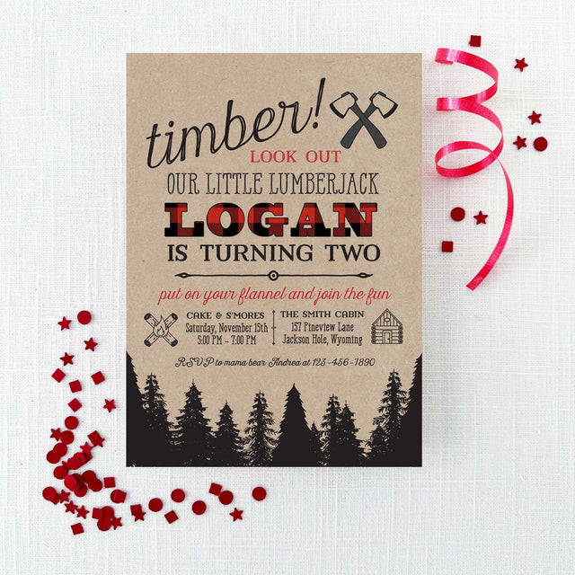 These rustic Lumberjack Birthday Party Invitations are perfect for celebrating your little adventurous one's birthday. It features a rustic background with red and black buffalo plaid accents and fun mix of fonts and tree border.