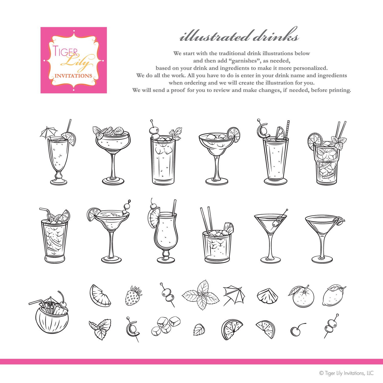 - Signature Drink Illustration: We do all the work. All you have to do is enter in your drink name and ingredients when ordering and we will create the illustration for you based on your drink details. Shown with 1 signature drink, but we can include additional drinks if you prefer.