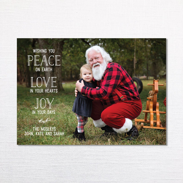 Let your Santa or family photo take center stage with this simple and modern Peace Love Joy Holiday Christmas Card.
