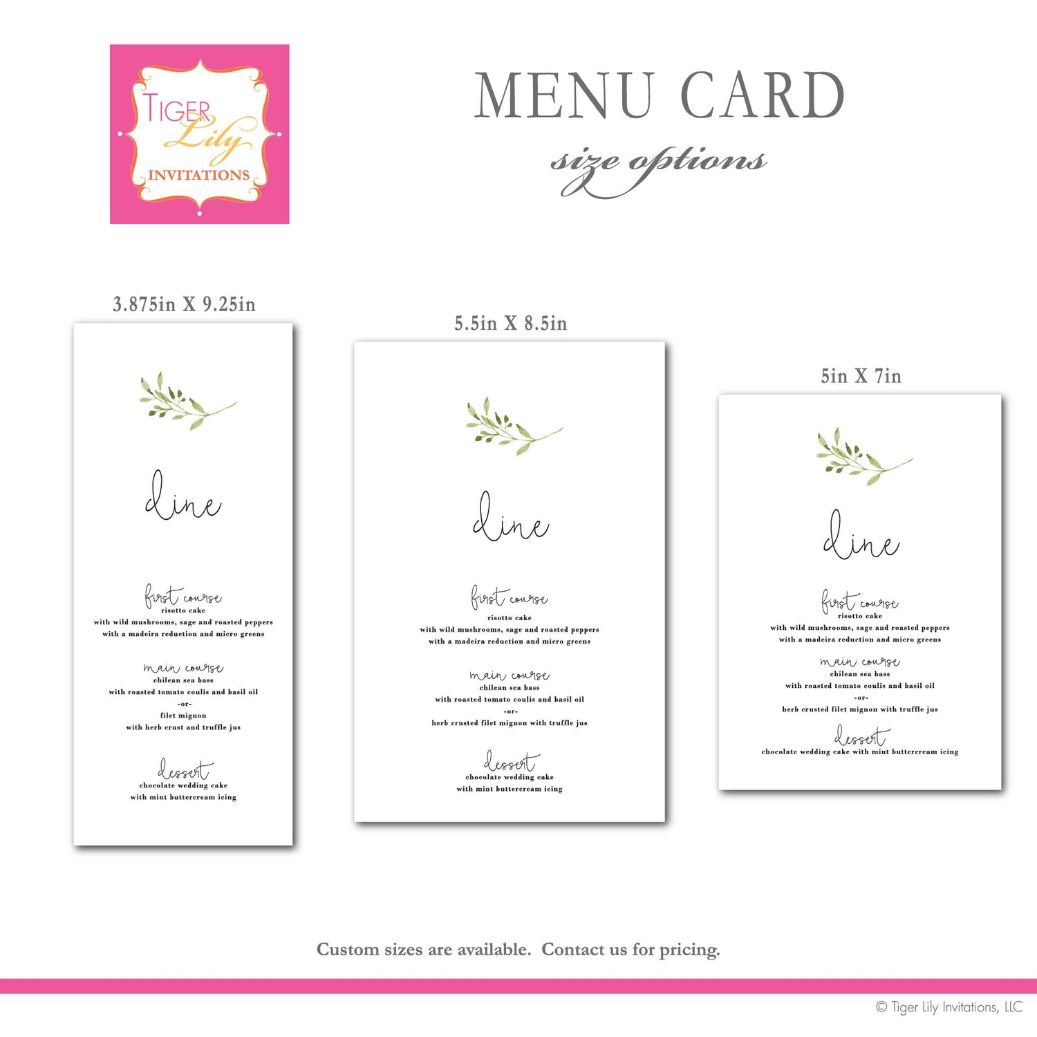 Our Minimal Greenery Menu Cards are the perfect complement to any spring, summer, or garden wedding. They feature a pretty combination of handlettered script font and minimal block fonts with with a small sprig of greenery at the top.