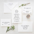 Our Classic Wreath Invitation is simple and sophisticated. With traditional wreath monogram at the top and elegant script and block font mix, this is invitation is perfect for so may ceremonies - from a formal church wedding to elegant outdoor garden wedding. It is beautiful in the classic black and white, but we can change the ink colors to match your wedding style.