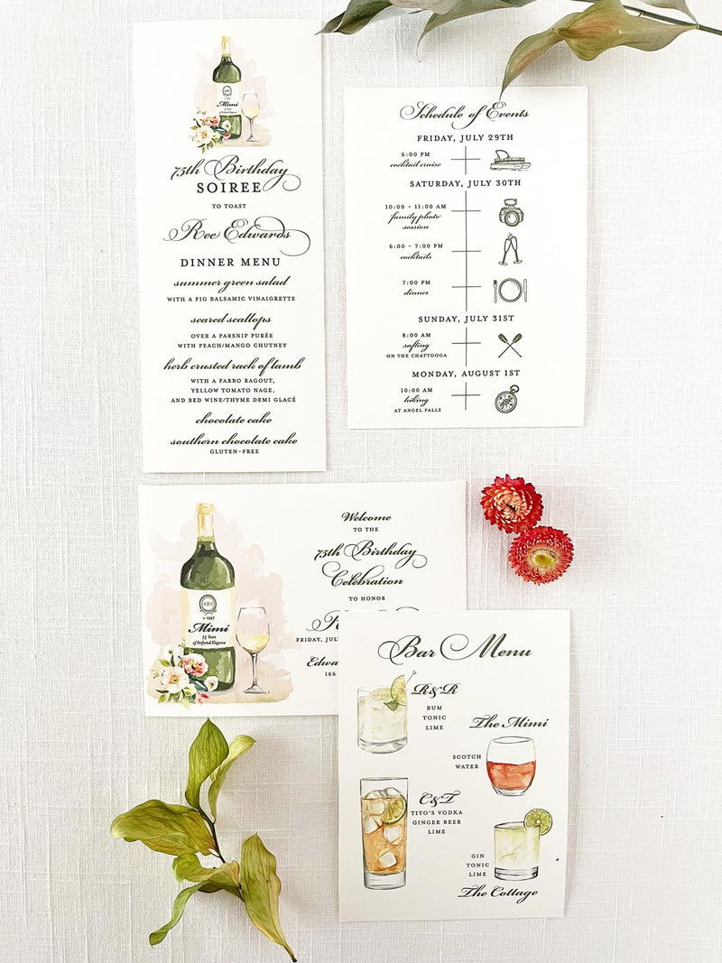 We start with a consultation to gather all your ideas, then the magic begins. The sky is the limit as far as design goes and we work side by side with our clients throughout the process to create the perfect invitation and day-of stationery for their special event.